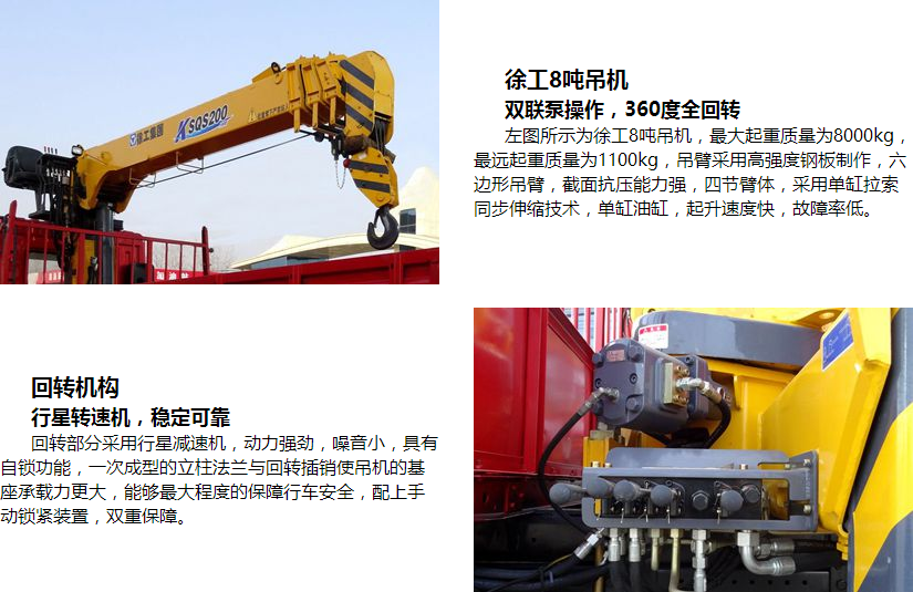 随车吊全称随车起重运输车,是一种通过液压举升及伸缩系统来实现货物的升降、回转、吊运的设备,通常装配于载货汽车上。一般由载货汽车底盘、货厢、取力器、吊机组成。载货汽车底盘可选东风、解放、欧曼、斯太尔等各吨位。吊机按厂家可分为铁运、徐工、江环,宇通重工,飞涛、石煤等,按吊机类型分为直臂式和折臂式,按吨位分为2吨、3.2吨、5吨、6.3吨、8吨、10吨、12吨、16吨、20吨